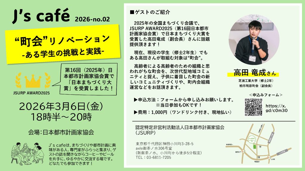 J’s cafeは、まちづくりや都市計画に興味がある人、専門家がふらっと集まり、ゲストの話を聞きながらコーヒーやビールを片手に、ゆるやかに交流する場です。 どなたでも参加できます! ★ ★ ★ 今回のJ’sカフェは、2025年の全国まちづくり会議で、JSURP... -