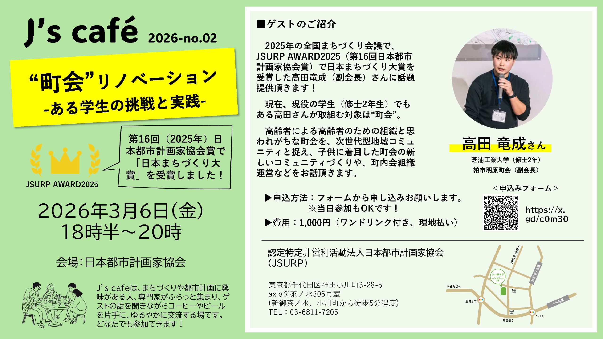 今回のJ’sカフェは、2025年の全国まちづくり会議で、JSURP AWARD2025(第16回日本都市計画家協会賞)で日本まちづくり大賞を受賞した柏市明原町会の副会長である高田竜成さんに話題提供いただきます!