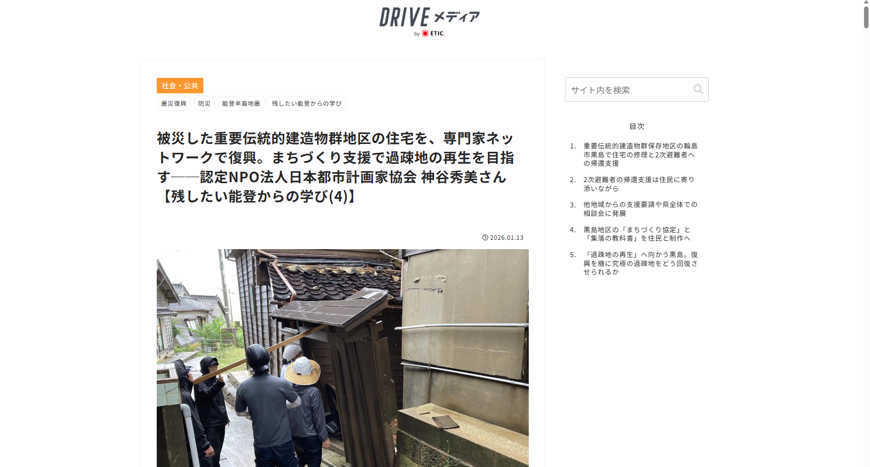 JSURPが支援を続けている輪島市黒島地区での復興支援の取組について、ETIC.が運営するWEBメディア「DRIVEメディア」に掲載されました。